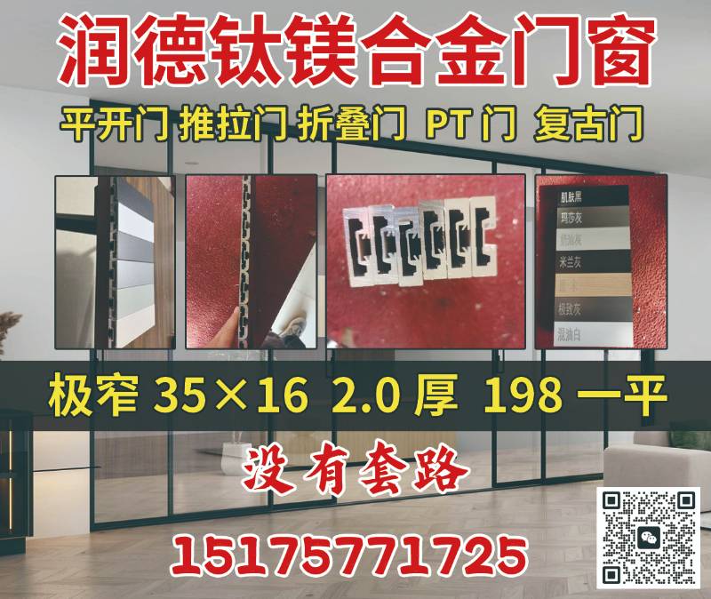 润德钛镁合金门主营:推拉门,平开门,有07系列,10超窄,16极窄,博洛尼系列,45中窄,55中窄,65中窄,小折叠。产品环保,耐用,耐腐蚀,不褪色,隔音好的特点