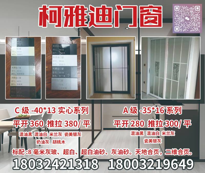 柯雅迪门窗主营:钛镁合金门,标配:8毫米灰玻、超白、超白油砂、灰油砂。天地合页,二维合页。