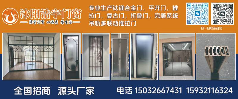 沐阳浩宇门窗主营:专业生产钛镁合金门,平开门,推拉门,复古门,折叠门,完美系统 吊轨多联动推拉门