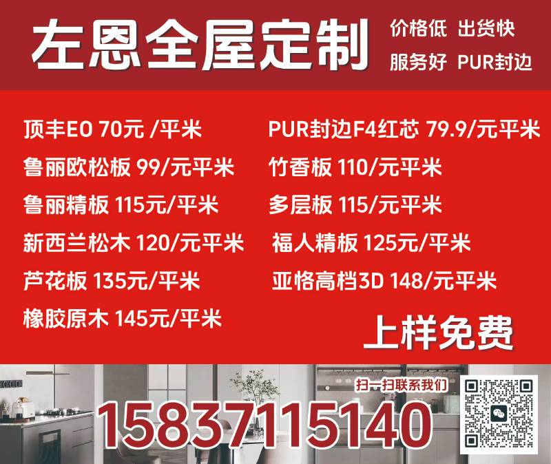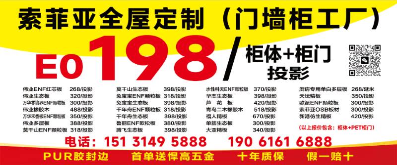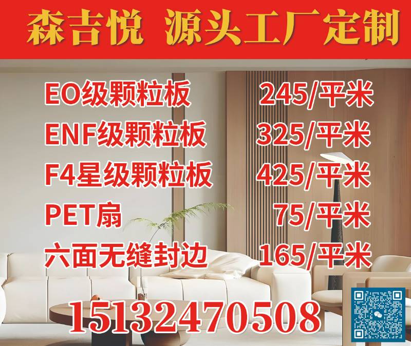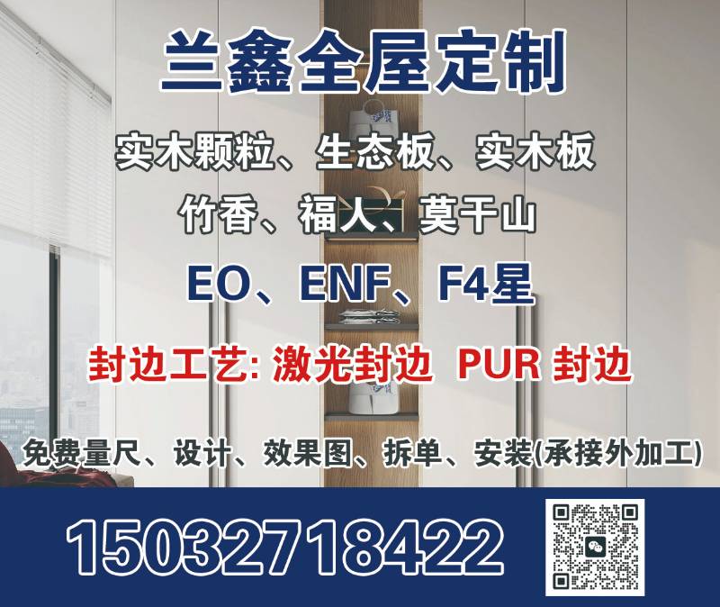 兰鑫装饰材料厂主营:实木颗粒、生态板、实木板 竹香、福人、莫干山EO、ENF、F4星 封边工艺: 激光封边 PUR封边,免费量尺、设计、效果图、拆单、安装(承接外加工)