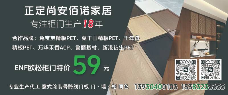 尚安佰诺定制门板厂主营:兔宝宝精板PET、莫干山精板PET、千年舟 精板PET、万华禾香ACP、鲁丽基材、新港仿生PET