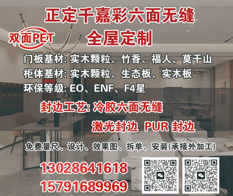 千嘉彩六面无缝全屋定制主营:六面无缝双面PET全屋定制,门板基材:实木颗粒、竹香、福人、莫干山,柜体基材: 实木颗粒、生态板、实木板,环保等级: EO、ENF、F4星