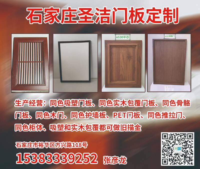 石家庄圣洁门板定制主营:同色吸塑门板、同色实木包覆门板、同色骨骼 门板、同色木门、同色护墙板、PET门板、同色推拉门、 同色柜体、吸塑和实木包覆都可做旧描金