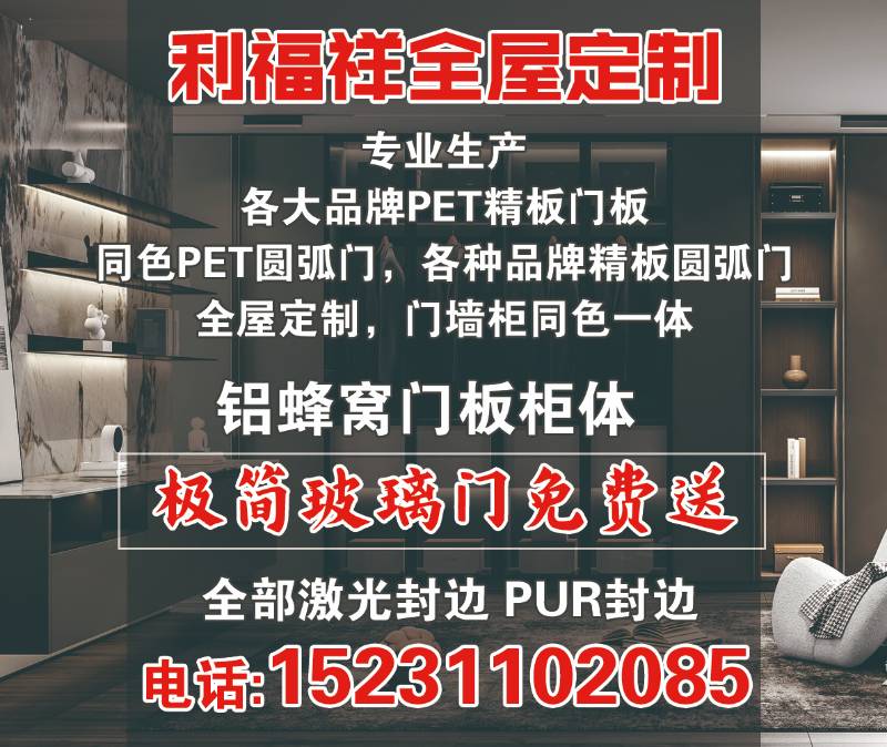 利福祥全屋定制主营:专业生产 各大品牌PET精板门,板 同色PET圆弧门,各种品牌精板,圆弧门 ,全屋定制,门墙柜同色一体 铝蜂窝门板柜体