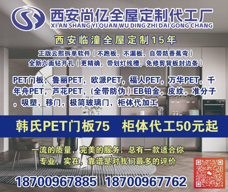 西安尚亿全屋定制代工厂主营:PET门板,鲁丽PET,欧派PET,福人PET,万华PET,千 年舟PET,芦花PET,(全带防伪)EB铂金,皮纹,准分子 ,吸塑,移门,极简玻璃门,柜体代加工
