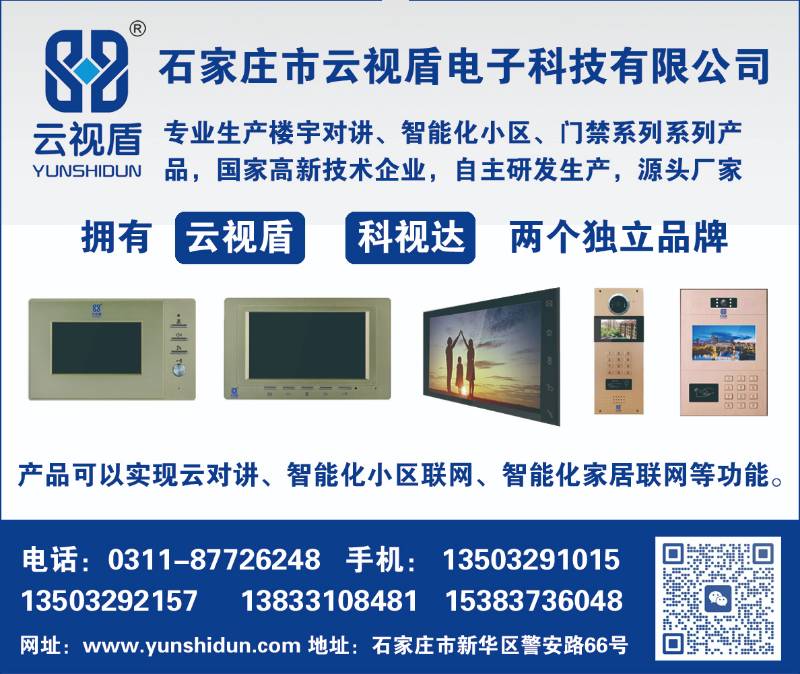 石家庄市云视盾电子科技有限公司主营:生产楼宇对讲 指纹锁楼宇对讲系统,安防监控系统,门禁报警系统同时具备智能化社区运营,弱电系统集成等资质