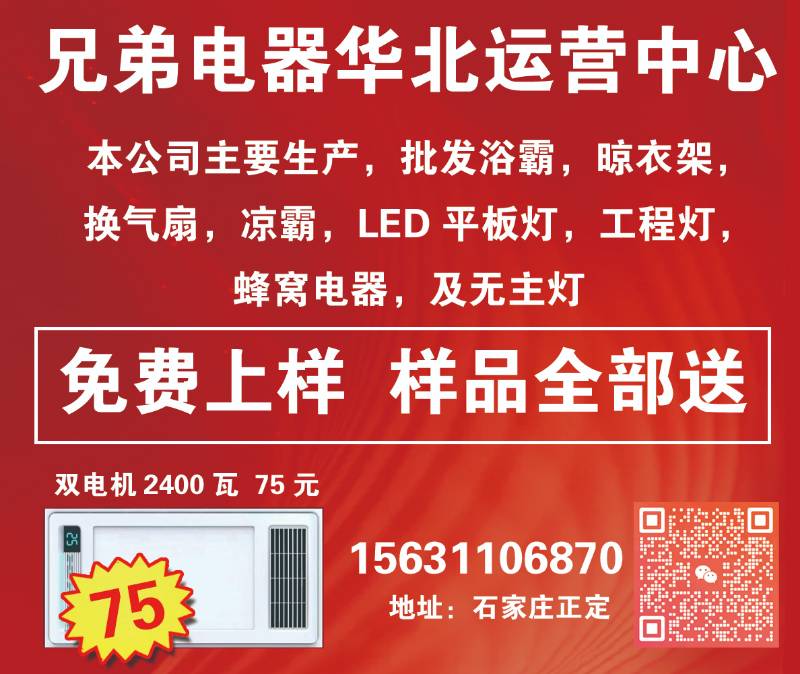 兄弟电器华北运营中心主营:主要生产,批发浴霸,晾衣架,换气扇,凉霸,LED 平板灯,工程灯,蜂窝电器,及无主灯