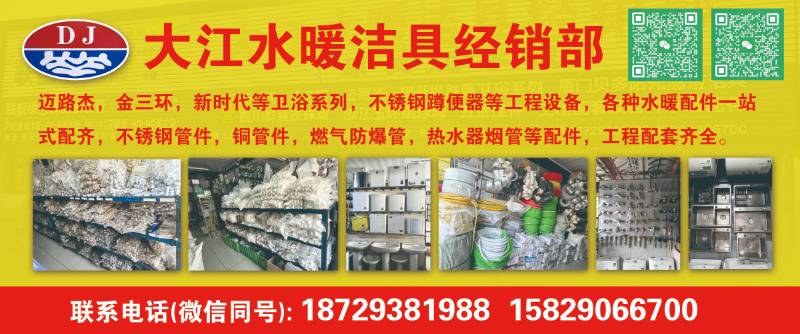 大江水暖洁具经销部主营:迈路杰,金三环,新时代等卫浴系列,不锈钢蹲便器等工程设备,各种水暖配件一站式配齐,不锈钢管件,铜管件,燃气防爆管,热水器烟管等配件,工程配套齐全。